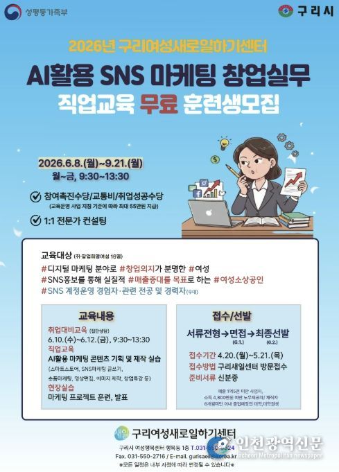 [인천광역신문] 최예준 기자 | 구리시는 구리새일센터에서 여성들의 디지털 마케팅 역량을 강화하고 성공적인 취·창업을 지원하기 위해 ‘AI 활용 SNS 마케팅 창업 실무’ 직업교육훈련 과정의 교육생을 오는 4월 20일부터 모집한다고 밝혔다.