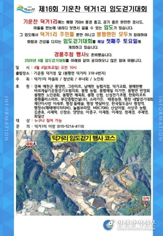 [인천광역신문] 최예준 기자 | 평창군 봉평면 덕거1리(이장 안현태)에서 지역 주민과 방문객이 함께하는'제16회 기운찬 덕거리 임도걷기대회'가 오는 4월 4일 개최된다.