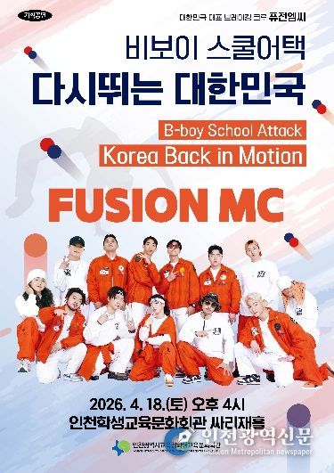[인천광역신문] 최예준 기자 | 인천광역시교육청학생교육문화회관은 오는 18일 대공연장 싸리재홀에서 ‘퓨전엠씨 비보이 스쿨어택 다시 뛰는 대한민국’ 공연을 개최한다.