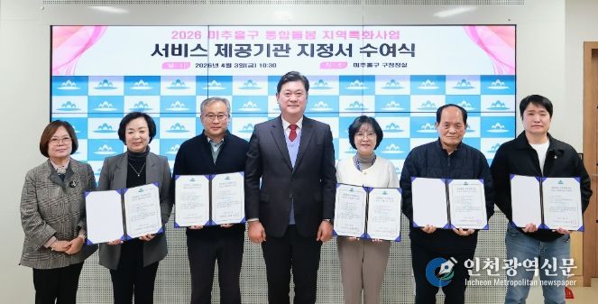 [인천광역신문] 최예준 기자 | 인천 미추홀구는 3일 구청장실에서 ‘2026년 미추홀구 통합 돌봄 지역특화 사업을 수행할 서비스 제공기관 5곳에 지정서를 수여했다고 밝혔다.