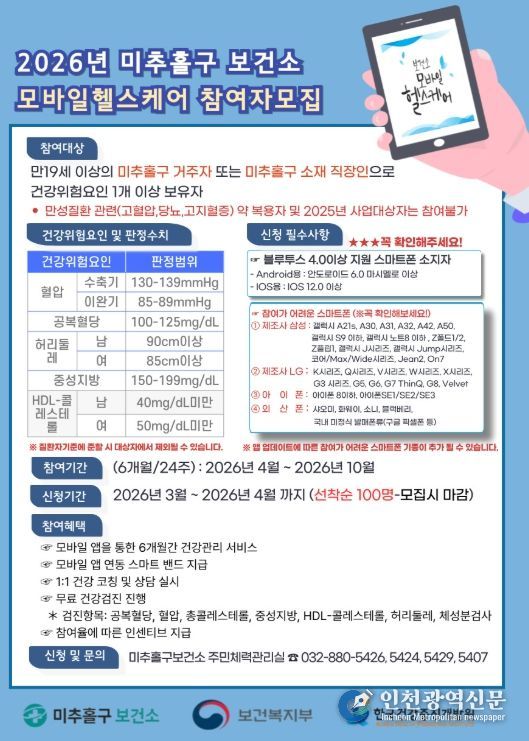 [인천광역신문] 최예준 기자 | 인천 미추홀구보건소는 정보통신기술(ICT) 기반의 비대면 건강관리 서비스인 ‘모바일 헬스케어 사업’을 오는 4월부터 11월까지 본격 추진한다고 밝혔다.