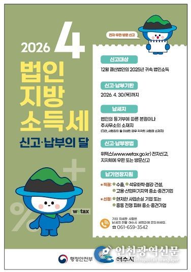 [인천광역신문] 최예준 기자 | 여수시는 4월 한 달간 ‘2025년 귀속 법인지방소득세에 대한 집중 신고·납부 기간’을 운영한다고 밝혔다.