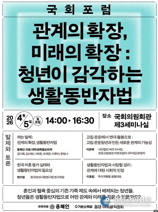 [인천광역신문] 최예준 기자 | 6 3 지방선거를 앞두고 다양한 청년정책이 발표되는 가운데, 청년 당사자가 직접 청년정책으로서 생활동반자법의 의미와 필요성을 조망하는 국회포럼이 개최된다. 이날 포럼에는 50여 명의 청년 당사자가 참석해 생활동반자법에 대한 의견을 나눌 예정이다.