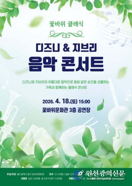 [인천광역신문] 최예준 기자 | 울산 동구 꽃바위문화관은 오는 4월 18일 오후 3시, 3층 다목적공연장에서 2026년 기획 공연으로 가족 클래식 콘서트를 선보인다.