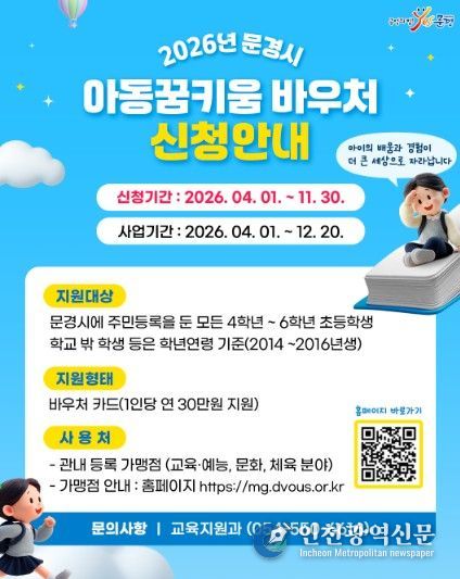 [인천광역신문] 최예준 기자 | 문경시는 지역 아동의 건강한 성장과 다양한 체험 기회를 지원하기 위해 추진한 ‘아동꿈키움 바우처 지원사업’을 본격 시행하고, 대상 아동에게 바우처 카드 발급을 시작했다.
