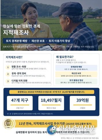 [인천광역신문] 최예준 기자 | 충북도가 3일 토지의 실제 이용 현황과 일치하지 않는 지적공부의 등록 사항을 바로잡기 위해 ‘2026년 제1차 지적재조사지구’ 15개소를 지정․고시했다고 밝혔다.
