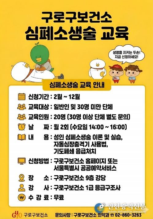 교육 신청은 구로구보건소 누리집 또는 서울특별시 공공예약서비스에서 가능하며, 교육비는 전액 무료다. 다만 신청 인원이 5명 미만일 경우 일정이 변경될 수 있다.