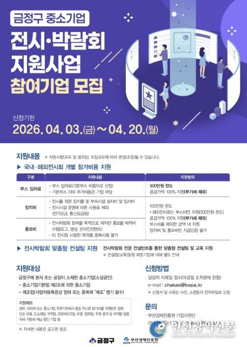 [인천광역신문] 최예준 기자 | 부산 금정구는 관내 중소기업의 판로 개척과 시장 경쟁력 강화를 위하여 ‘금정구 중소기업 전시박람회 참가 지원 사업’ 참여 기업을 오는 4월 20일까지 모집한다고 밝혔다.