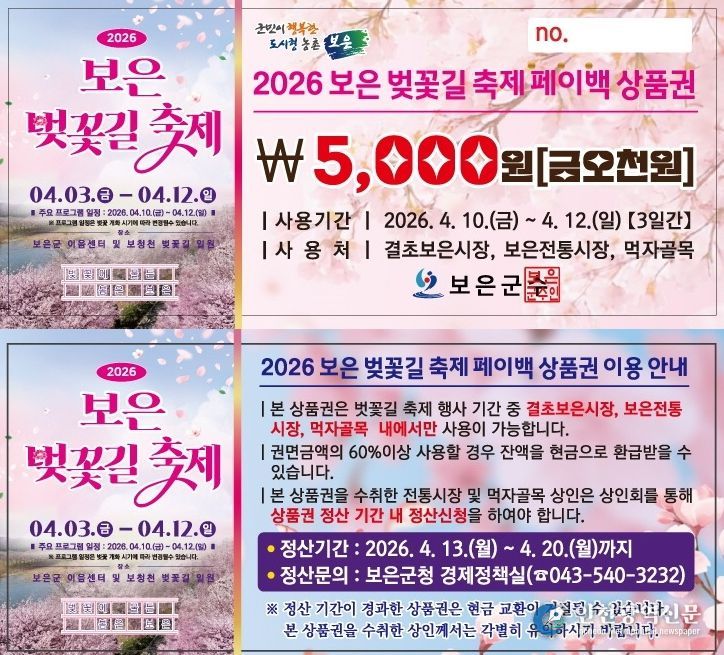 [인천광역신문] 최예준 기자 | 충북 보은군은 ‘2026 보은 벚꽃길 축제’를 맞아 외지 방문객의 소비를 유도하고 지역 상권에 활력을 불어넣기 위한 ‘전통시장 및 상권 활성화 페이백 이벤트’를 추진한다고 6일 밝혔다.