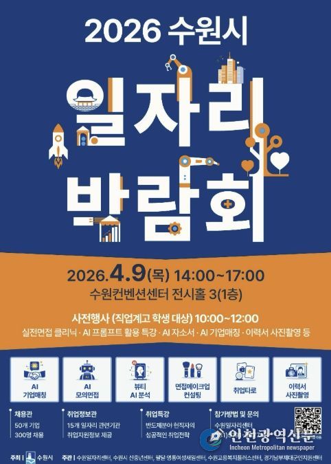 [인천광역신문] 최예준 기자 | 수원특례시는 9일 오후 2시부터 5시까지 수원컨벤션센터 전시홀에서 ‘2026 수원시 일자리박람회’를 개최한다.