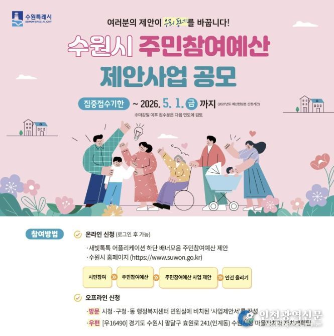 [인천광역신문] 최예준 기자 | 수원특례시는 2027년도 예산 편성을 위한 ‘주민참여예산 제안사업’을 5월 1일까지 공모한다.