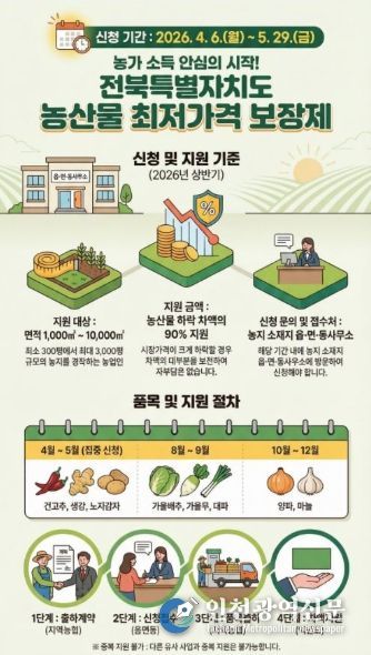 [인천광역신문] 최예준 기자 | 전북특별자치도는 가격 변동성이 큰 농산물에 대한 경영안정 지원을 위해 ‘2026년 주요농산물 가격안정 지원사업’ 신청을 4월 6일부터 오는 5월 29일까지 접수한다.
