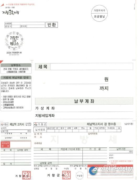 [인천광역신문] 최예준 기자 | 거창군은 고령층 납세자의 가독성과 납부 편의를 높이기 위해 4월부터 큰글씨 체납고지서를 제작해 발송한다고 밝혔다.