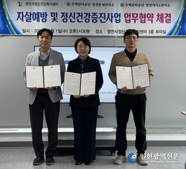 [인천광역신문] 최예준 기자 | 영천시는 지난 1일, 정신건강복지센터와 주택관리공단 문내관리소, 야사4관리소가 지역주민 자살예방 및 정신건강 증진을 위한 업무협약을 체결했다고 밝혔다.