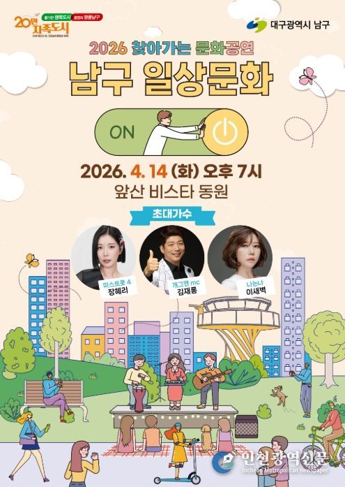 [인천광역신문] 최예준 기자 | 대구 남구는 지역 주민들에게 일상 속 문화 향유 기회를 확대하고, 지역 예술가들의 공연 활동을 지원하기 위해 ‘2026 찾아가는 문화공연’ 을 개최한다.