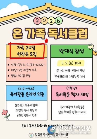 [인천광역신문] 최예준 기자 | 인천광역시교육청연수도서관은 5월 9일부터 가족이 함께 책을 매개로 소통하며 성장하는 ‘온 가족 독서클럽’을 운영한다.