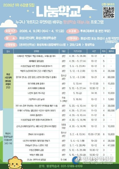 [인천광역신문] 최예준 기자 | 화성특례시는 시민 간 지식과 재능을 나누는 평생학습 프로그램 ‘나눔학교’의 2026년 1차 수강생을 오는 4월 9일부터 4월 17일까지 선착순으로 모집한다.