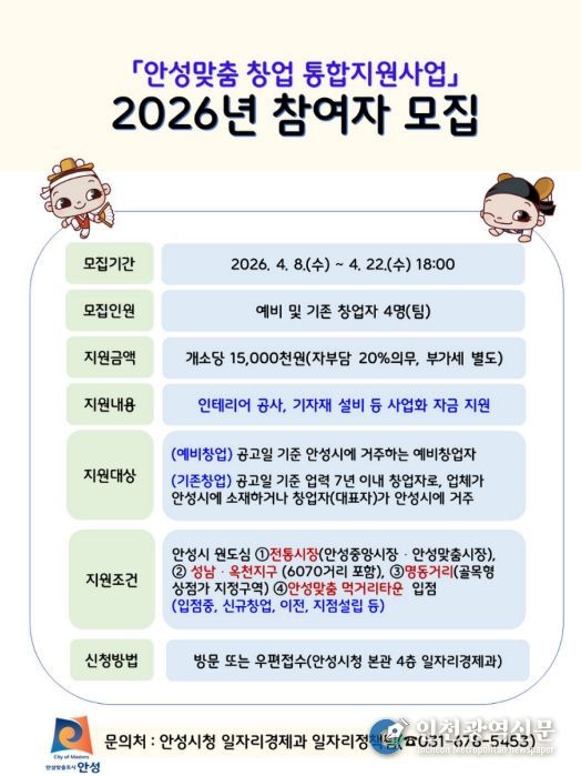 [인천광역신문] 최예준 기자 | 안성시는 오는 4월 8일 수요일부터 22일 수요일까지 ‘2026년 안성맞춤 창업 통합지원사업’ 참여자를 모집한다. 이번 사업은 전통시장과 골목상권에 창업을 유도함으로써 지역 상권을 활성화하고, 이를 차세대 문화·관광 자원으로 발전시키기 위해 기획됐다.