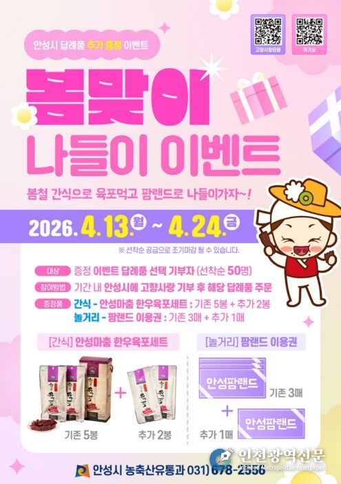 안성시 관계자는 “봄나들이와 어울리는 간식 및 체험형 답례품을 연계해 기부자의 만족도를 높이고자 이번 이벤트를 마련했다”며, “앞으로도 계절별 특색을 살린 다양한 이벤트를 통해 고향사랑기부 참여를 확대해 나가겠다”고 말했다.