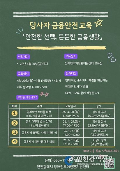 [인천광역신문] 최예준 기자 | 인천시사회서비스원 소속 인천시장애인주거전환지원센터는 당사자 금융 안전교육 ‘안전한 선택, 든든한 금융 생활’ 참가자를 모집한다고 6일 밝혔다.