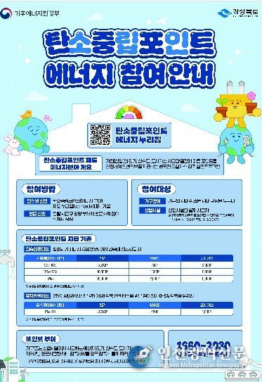 [인천광역신문] 최예준 기자 | 경상북도는 도민의 탄소중립 실천을 유도하고 온실가스 감축을 확대하기 위해 ‘탄소중립포인트제(에너지·자동차 분야)’ 참여자를 모집한다.