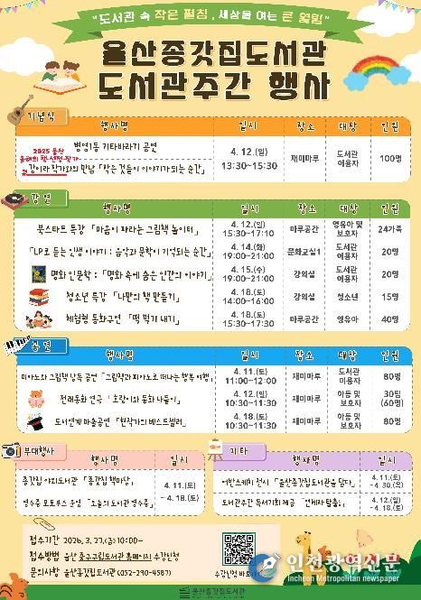 [인천광역신문] 최예준 기자 | 울산 중구가 제62회 도서관의 날·도서관 주간(4. 12.~4. 18.)을 맞아 4월 11일부터 4월 18일까지 지역 내 도서관 10곳에서 ‘2026년 도서관의 날·도서관 주간 행사’를 개최한다.