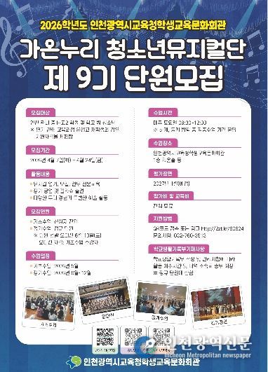 [인천광역신문] 최예준 기자 | 인천광역시교육청학생교육문화회관은 4월 7일부터 24일까지 인천 지역 청소년을 대상으로 ‘2026년 청소년뮤지컬단 제9기’ 신규 단원을 모집한다.