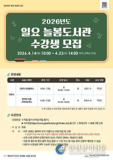 [인천광역신문] 최예준 기자 | 경상북도교육청 금호도서관은 초등학생들에게 학교의 정규수업 외 추가적인 교육활동의 기회를 부여하기 위하여‘2026년 일요 늘봄도서관’프로그램을 개설하여 수강생을 모집한다.