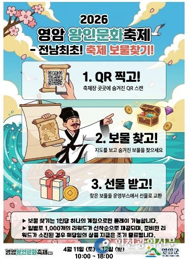 홍연주 영암군 관광과장은 “이번 보물찾기 프로그램은 전라남도 최초로 도입되는 디지털 기반 축제 콘텐츠”라며 “다양한 연령층, 특히 젊은 관광객 유입을 통해 축제의 활력을 높이고, 영암왕인문화축제의 브랜드 가치를 한층 강화할 것으로 기대한다”고 밝혔다.