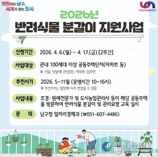 [인천광역신문] 최예준 기자 | 부산 남구는 구민들의 반려식물 관리에 대한 이해를 돕고 관리 능력을 높이기 위해 ‘2026년 반려식물 분갈이 지원사업’에 참여할 공동주택을 모집한다고 밝혔다.