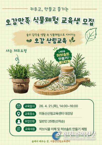 교육 내용은 ▲허브식물의 이해(이론)를 비롯해 가정에서의 관리요령 ▲새순 채취 방법 ▲허브솔트 만들기 체험 등 맞춤형 실습 프로그램으로 운영되며, 일반인 25명을 대상으로 지난 6일부터 미동산수목원 누리집(홈페이지)를 통해 선착순 모집을 진행하고 있다.
