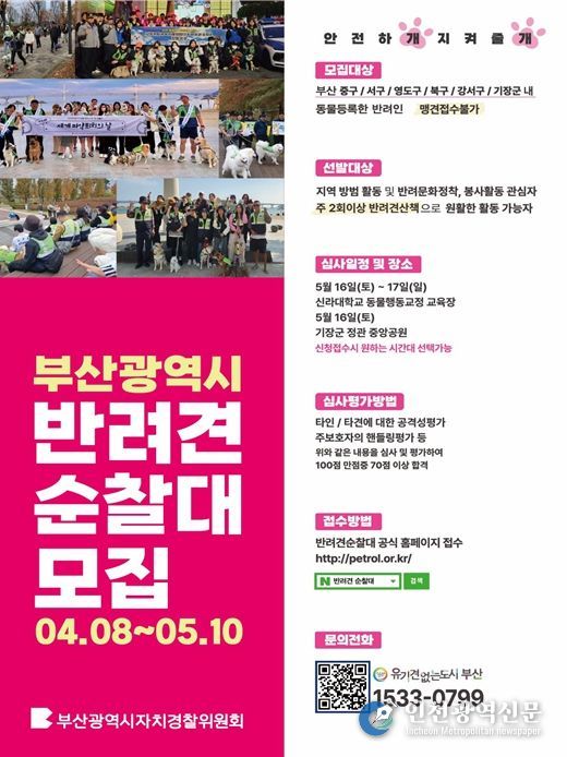 [인천광역신문] 최예준 기자 | 부산광역시자치경찰위원회는 올해 '부산 반려견 순찰대'를 부산 전 자치구로 확대 운영한다고 밝혔다.