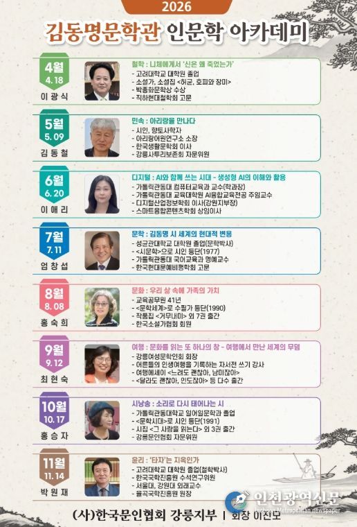 [인천광역신문] 최예준 기자 | 강릉시는 시민들의 인문학적 소양을 높이고, 지역 문화 거점인 김동명문학관 활성화를 위해 오는 4월부터 인문학 프로그램을 본격적으로 추진한다.