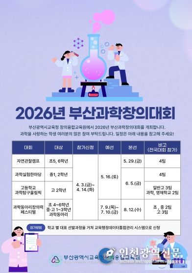 [인천광역신문] 최예준 기자 | 부산광역시교육청창의융합교육원은 오는 14일까지 과학 분에야 재능과 관심이 있는 부산 지역 초·중·고등학생을 대상으로 ‘2026년 부산과학창의대회’ 참가 신청을 받는다고 8일 밝혔다.