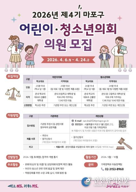 [인천광역신문] 최예준 기자 | 마포구는 4월 6일부터 24일까지 ‘제4기 어린이·청소년의회’ 위원을 모집한다.