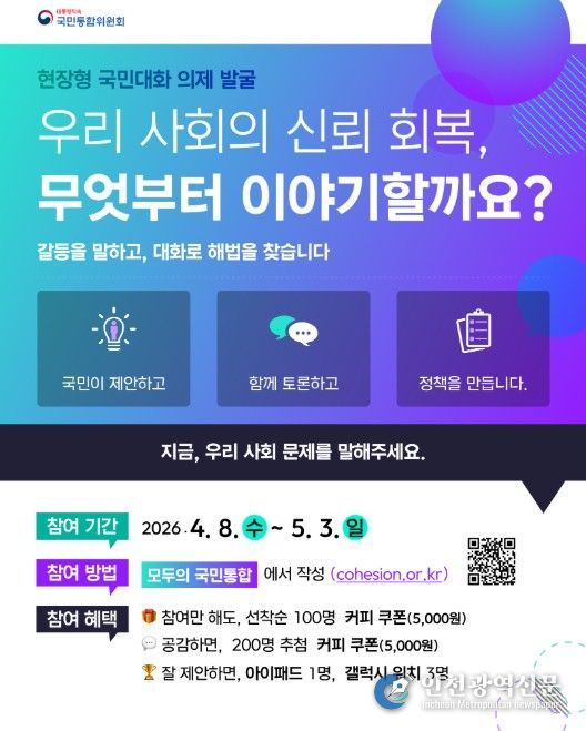 [인천광역신문] 최예준 기자 | 대통령직속 국민통합위원회는 올해부터 새롭게 추진하는 '현장형 국민대화'의 온라인 소통 창구인 ‘모두의 국민통합’ 을 4월 8일 10시에 개통하고, 국민통합을 향한 대화에 나선다.
