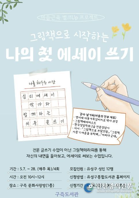 [인천광역신문] 최예준 기자 | 대전 유성구는 5월 7일부터 28일까지 구즉도서관에서 성인을 대상으로 ‘마음근육 벌크UP 프로젝트–그림책으로 시작하는 나의 첫 에세이 쓰기’ 프로그램을 운영한다.