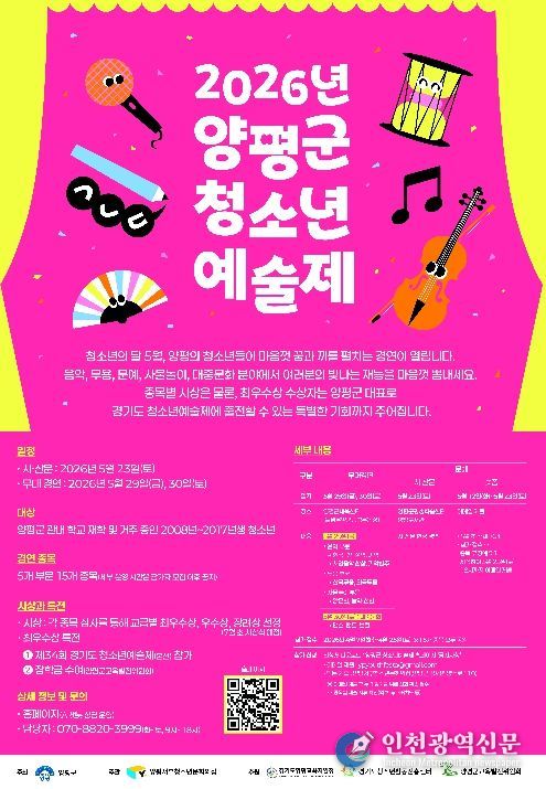 [인천광역신문] 최예준 기자 | 양평군이 주최하고 양평서부청소년문화의집이 주관하는 ‘2026년 양평군 청소년예술제’가 오는 5월 개최되며, 4월 7일부터 25일까지 예술제 참가자를 모집한다.