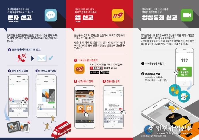 다매체 119 신고서비스는 기존 음성통화 방식 외에도 문자(SMS), 영상통화, 스마트폰 애플리케이션 등을 활용해 신고할 수 있는 제도다.