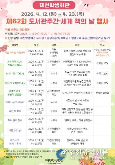 [인천광역신문] 최예준 기자 | 제천학생회관은 제62회 도서관주간(4. 12.~4. 18.)을 맞아 ‘도서관 속 작은 펼침, 세상을 여는 큰 열림’을 주제로 시민과 학생이 함께 즐길 수 있는 다양한 독서문화 행사를 마련했다.