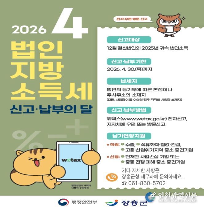 [인천광역신문] 최예준 기자 | 전남 장흥군은 4월 한 달 동안 2025년 12월 말 결산법인의 법인소득에 대한 법인지방소득세 집중 신고·납부 기간을 운영한다고 9일 밝혔다.