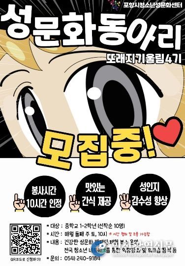 [인천광역신문] 최예준 기자 | 포항시청소년재단 청소년성문화센터가 청소년 성문화 동아리 ‘또래지기 울림’ 4기 회원을 모집한다.