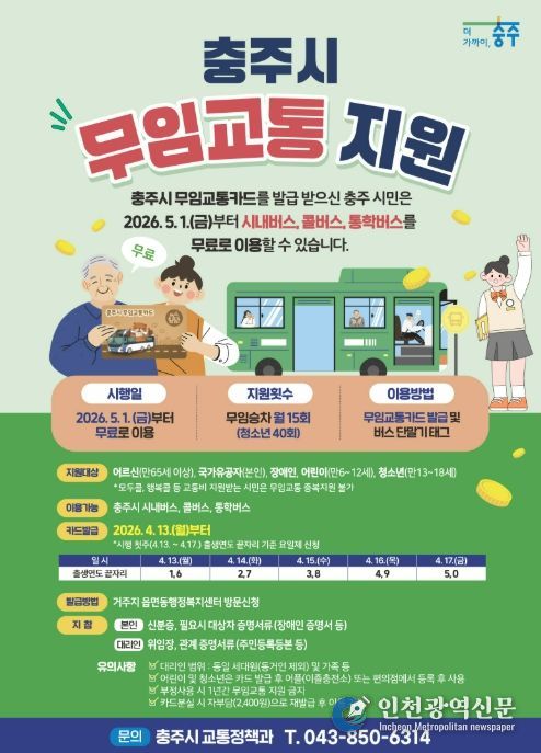 충주시는 오는 5월 1일부터 ‘어르신 등 시내버스 무임교통 지원’서비스를 시행한다고 밝혔다.