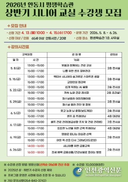 [인천광역신문] 최예준 기자 | 안동시 평생학습관은 지역 어르신들의 활기찬 노후 생활과 자기계발을 지원하기 위해 ‘2026년 상반기 시니어교실’ 수강생을 모집한다.