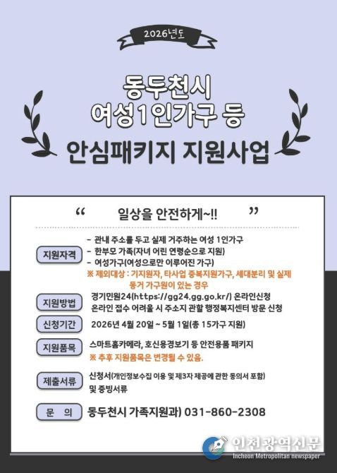 [인천광역신문] 최예준 기자 | 동두천시는 오는 4월 20일부터 5월 1일까지, 범죄에 취약한 여성 1인 가구와 여성으로 구성된 가구, 한부모 모자가정을 대상으로 ‘여성안심패키지 지원사업’ 신청을 접수한다고 밝혔다.