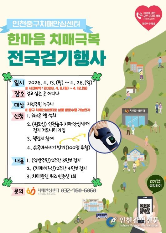 [인천광역신문] 최예준 기자 | 인천시 중구는 오는 13일부터 26일까지 2주간 치매 인식 개선과 주민 건강 증진을 위한 ‘한마음 치매극복 걷기’ 행사를 비대면으로 개최한다.