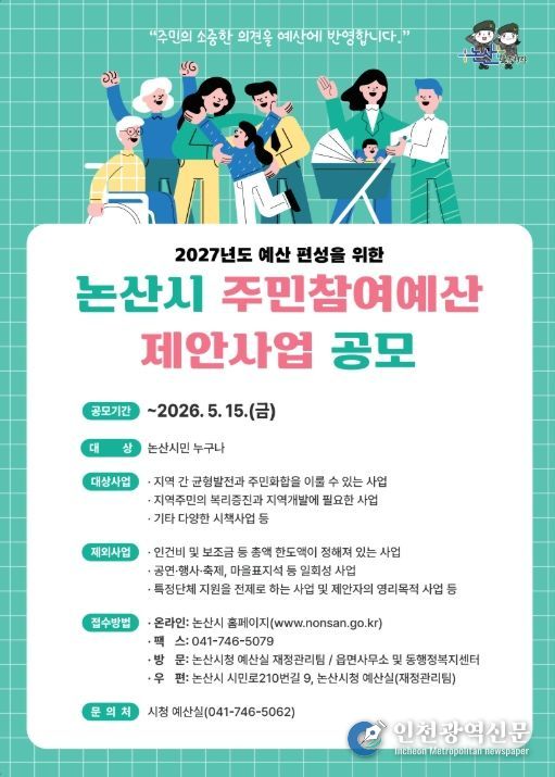 [인천광역신문] 최예준 기자 | 논산시는 오는 5월 15일까지 ‘2027년도 예산편성을 위한 주민참여예산 제안사업 공모’를 진행한다.