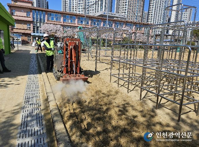 이번 사업은 ‘인천 학교현장지원 방안 100선’ 과제로 선정된 신규 사업으로 실외 어린이놀이시설의 놀이기구와 바닥재를 연 2회(상반기 4~6월, 하반기 9~11월) 소독한다.