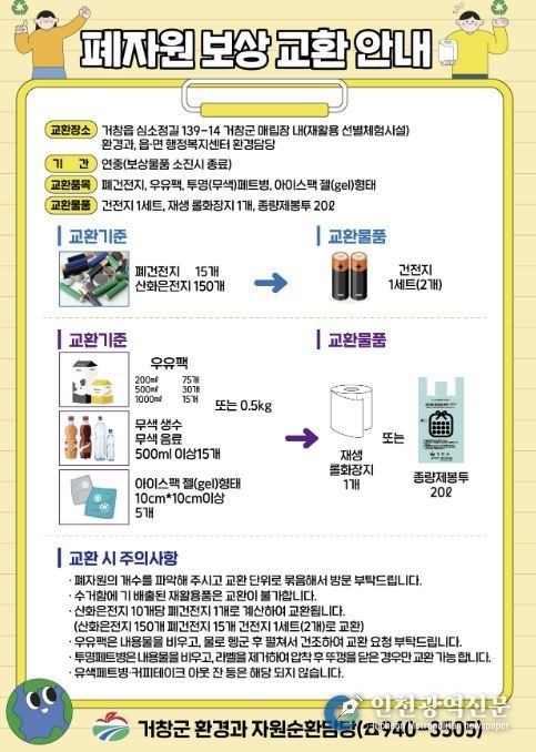 [인천광역신문] 최예준 기자 | 거창군은 자원순환 실천과 올바른 분리배출 문화 정착을 위해 폐자원보상 교환 사업을 확대 시행한다고 9일 밝혔다.