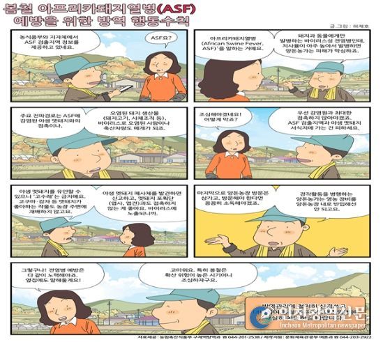 정창근 동물방역과장은 “봄철은 영농활동 증가와 야생멧돼지 활동 증가로 아프리카돼지열병(ASF) 유입 위험이 높은 시기”라며, “농가에서는 출입자 및 차량 통제, 농기계‧차량 소독 등 기본 방역수칙을 철저히 준수해 줄 것”을 당부했다.